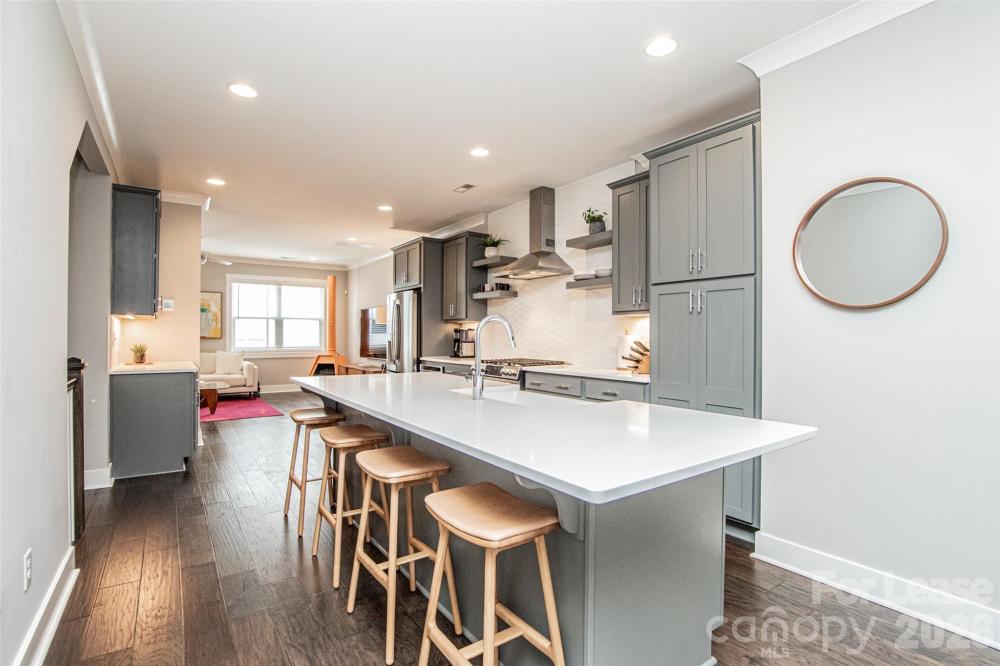 Modern, 3-story Luxury Townhome Rental in the heart of NoDa. Like-new and Spacious with 3 Full Bathrooms plus a powder room. Featuring 9-foot ceilings and wood flooring throughout (no carpet), the well designed second-floor main level features a light & bright open floorplan. Impressive Chefs Kitchen w/quartz countertops, premium cabinetry, a 30-inch gas cooktop w/exhaust hood, and a wine bar w/beverage refrigerator. Live & Entertain in the cozy Dining area and Expansive Great Room. Step outside to a private terrace overlooking a serene, wooded common area—perfect for relaxing. The upper level includes the Primary Suite and guest bedroom, along with a conveniently located laundry room. Each bedroom features an ensuite bath with tile flooring and walk-in closets. The Primary Suite has a HUGE closet w/Custom Closet System. Primary bath is highlighted by double quartz vanities, ample storage and a beautifully tiled walk-in shower. The first floor offers a comfortable den, office or flex space w/an additional Full bath, and a storage closet plus a Large attached 2-Car Garage. Enjoy a highly walkable lifestyle with close proximity to dining, entertainment, and the light rail, plus easy access to Uptown, Plaza-Midwood & Charlotte Airport. Pet friendly. Available for a mid-February move-in.