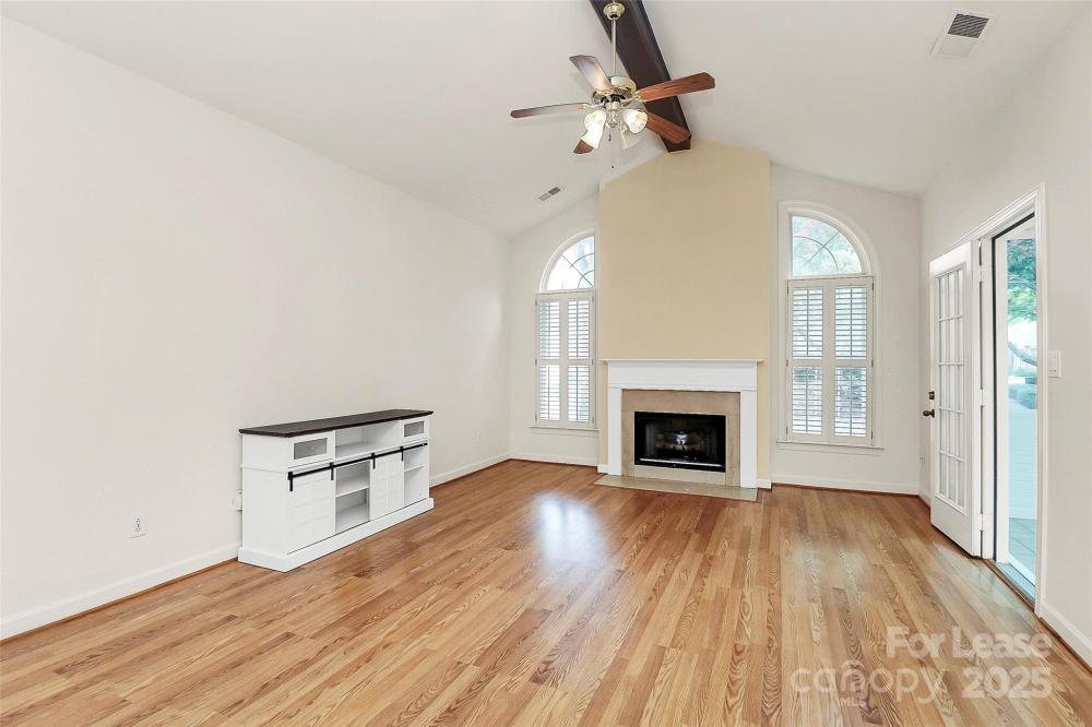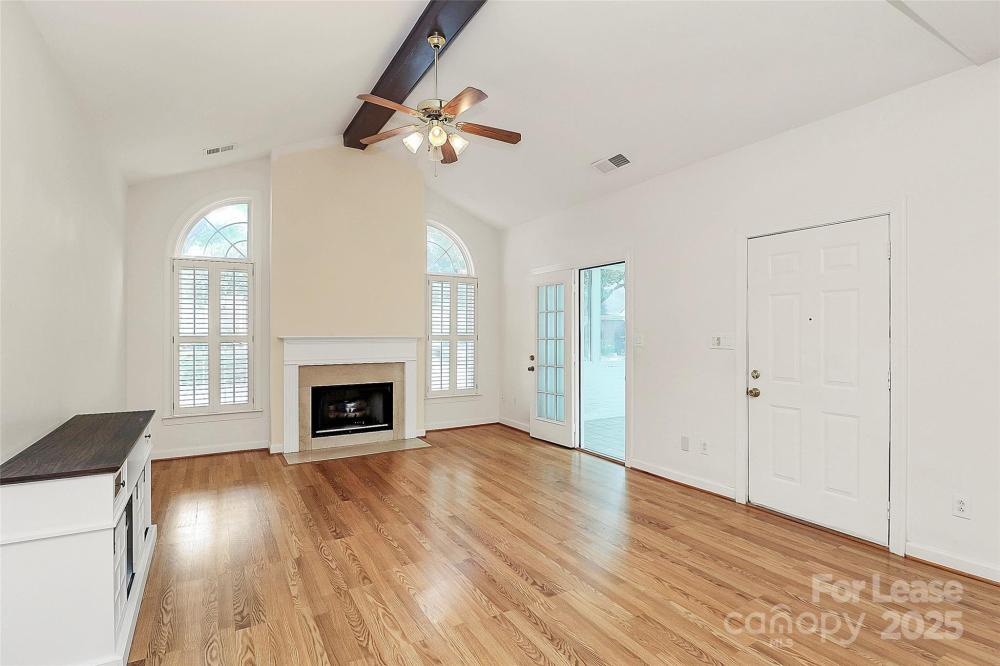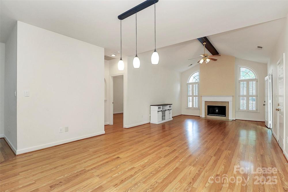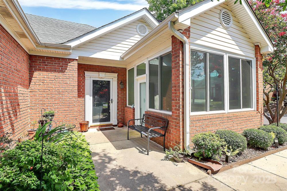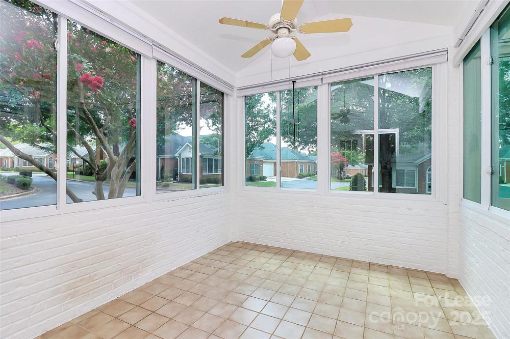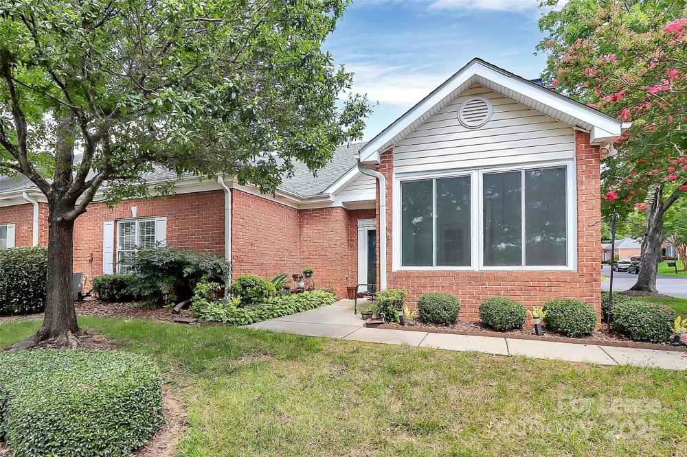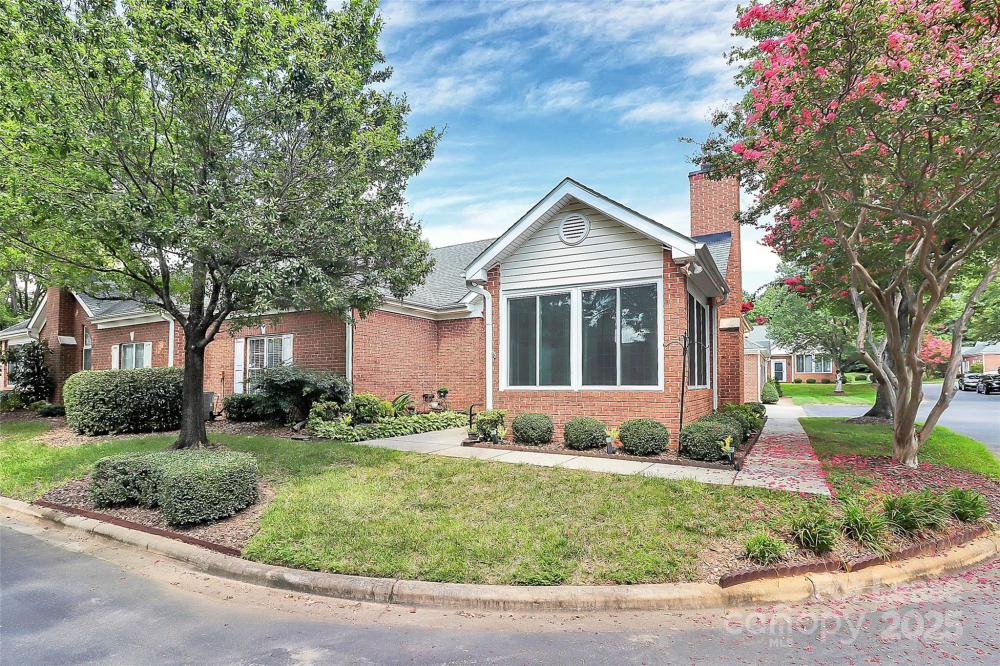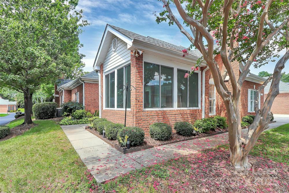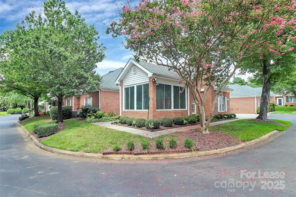Welcome to this rare end unit condo located in the sought after neighborhood of Troon At Ballantyne. Perfectly located within shopping and dining, come enjoy the community's incredible amenities, outdoor pool, clubhouse, fitness center, pond and more. This well maintained home features wood floors throughout and is very light and bright. The vaulted family room with a gas log fireplace is open and great for entertaining. There is a conveniently located sunroom attached that offers an additional 120 sq ft of space to relax and enjoy the natural light. The kitchen is large and nicely updated with an additional eat in area. The fantastic split bedroom plan boasts spacious bedrooms and attached bathrooms. The 2-car garage also has plenty of closet storage. Available now.