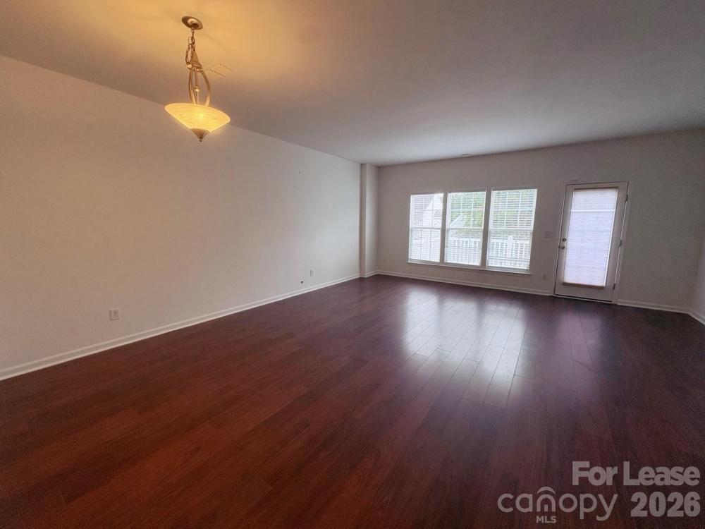 Three-story townhouse in the heart of Ballantyne! Freshly painted throughout. The first level features one bedroom, a half bath, hardwood flooring, and a garage. The second level includes the kitchen, living area, and another half bath, all with hardwood flooring, plus a deck that extends the living space. The third level offers two bedrooms with a full bath and spacious closets. The community amenities include a pond, pool, and recreation area. Conveniently located near shops, restaurants, I-485, and top-rated schools.