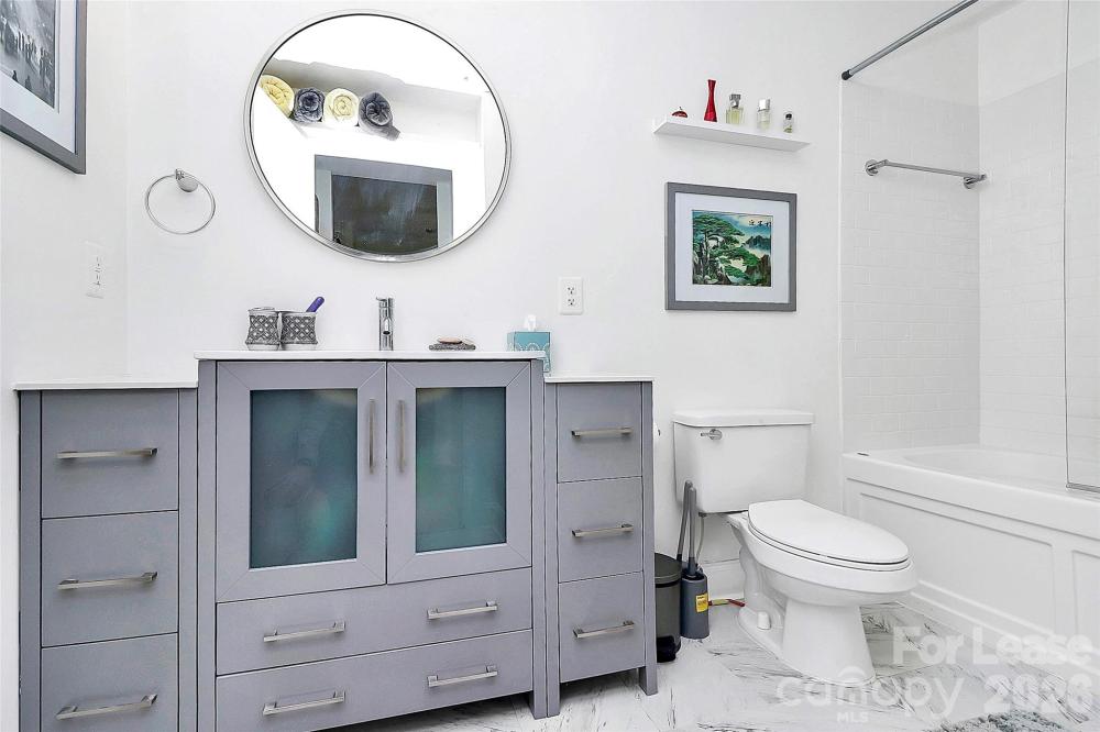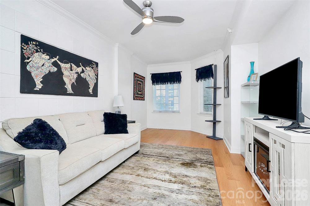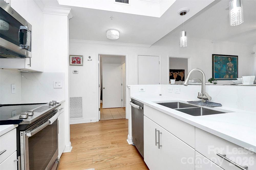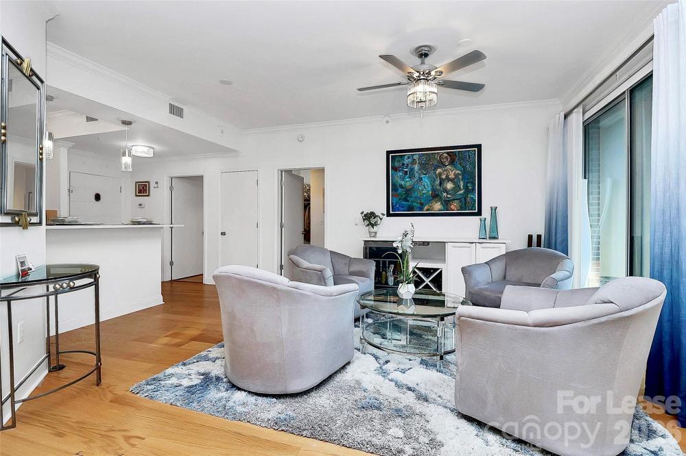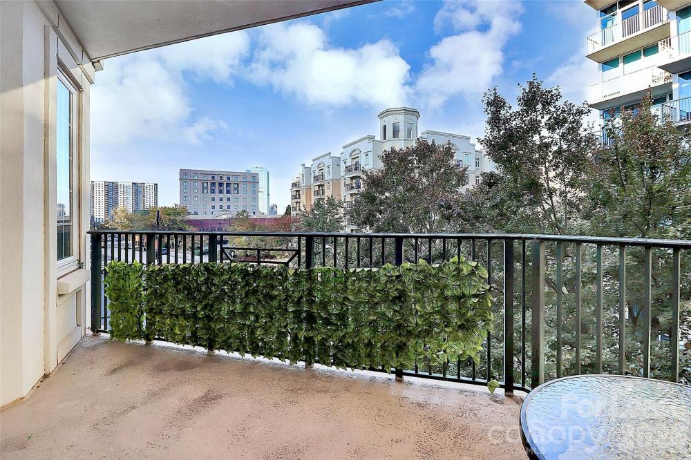 Experience elevated city living in this spacious 2-bedroom, 2-bath condo in the heart of Uptown Charlotte. This converted 3 bedroom offers an expansive open layout that boasts natural light and sweeping skyline views from your own private balcony. The modern kitchen is designed to impress, featuring silestone marble countertops, stainless steel appliances, and a private laundry room equipped with LG sensor machines and additional pantry storage. Both bedrooms are oversized en-suites with walk-in closets, providing exceptional comfort and privacy. Beautiful red oak engineered hardwoods run throughout the main living spaces, complemented by ultra-plush carpeting in the primary retreat and tile flooring in the bathrooms and laundry room. The spacious living area is enhanced by a built in bar with a wine rack and beverage cooler, perfect for entertaining. The home also features double window treatments for elegance and privacy with modern ceiling fans throughout. The home also includes a conveniently located end garage parking space on the P1 private parking level, offering easy access to Harris Teeter, the mailroom, and building entrances. Residents enjoy an impressive lineup of resort-style amenities, including a 24-hour concierge, fitness center, pool, billiards room, golf putting green, rooftop lounge, outdoor grilling areas, coffee bar, media center, a peaceful courtyard, and even a private dog park for your four-legged friends.